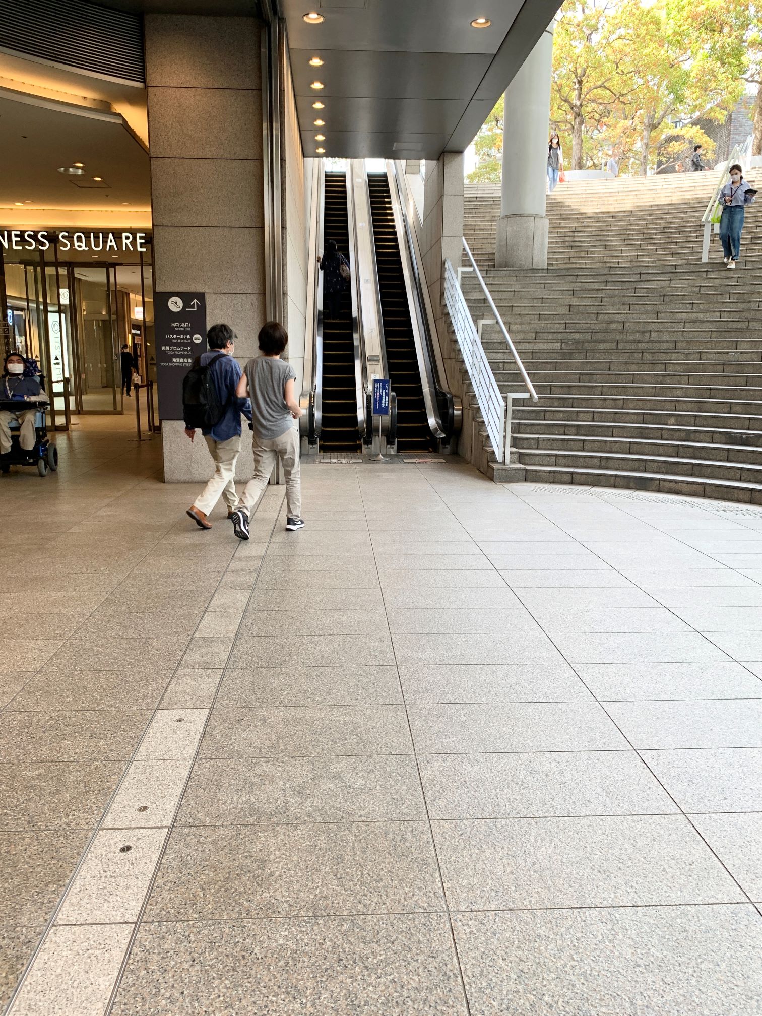 ●地上にあがると、エスカレーターご利用の場合は右手に、階段利用の場合は正面に、駅ビルの大きな赤い案内看板が見えますので、その看板を通り過ぎたすぐの道路を左手にお進みください。