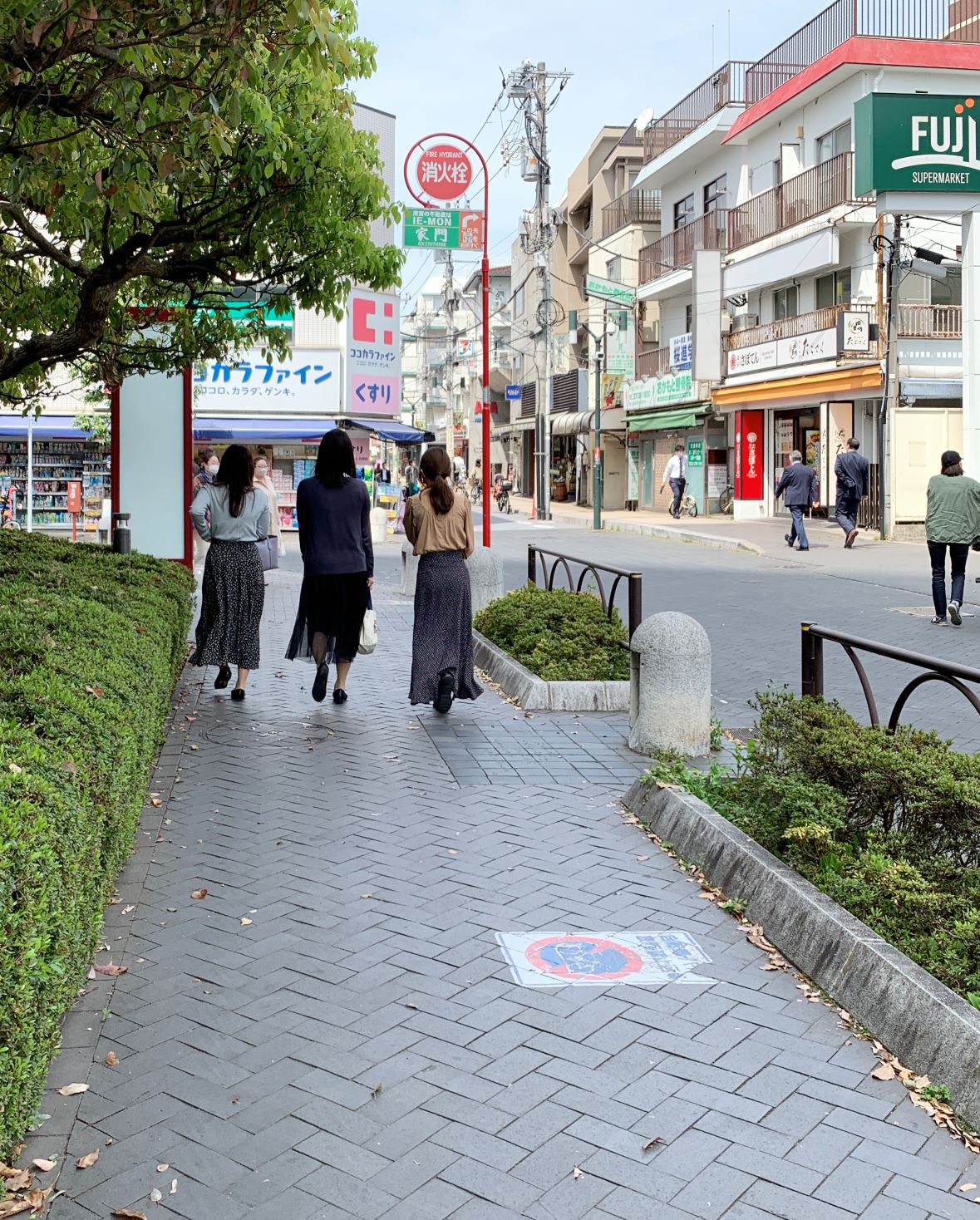 右手にFUJIスーパー、KALDI、左手に薬局がある道です。遠く右手にセブンイレブンが見えます。サロンはその建物内にあります。
